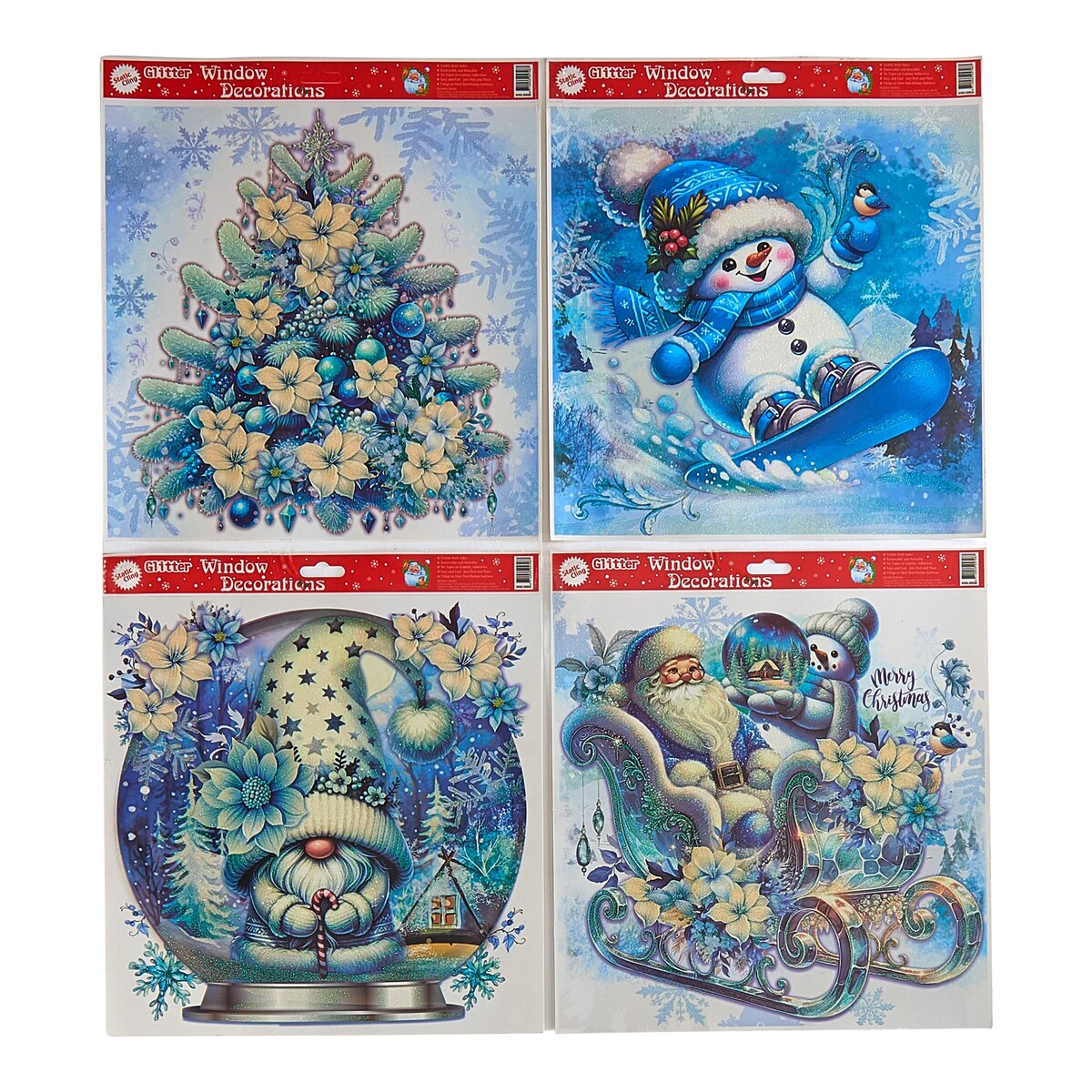 4 ambiances festives à coller sur vos fenêtres! Grâce à ces grands autocollants à motifs, vos fenêtres raconteront de joyeuses histoires hivernales avec Père Noël, bonhommes de neige, lutins et sapins. Jolis détails et décorés de paillettes. Faciles à poser et à retirer, ne laissent pas de traces.