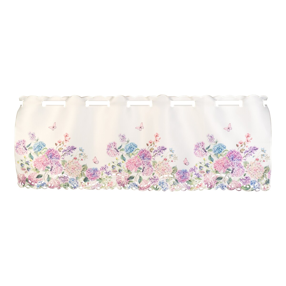 Ce brise-bise apporte élégance et légèreté à votre intérieur. Le modèle orné de papillons et d’hortensias arbore une magnifique bordure dorée. Mi-brodé, mi-imprimé: une superbe pièce décorative dans la cuisine, la salle à manger ou le salon.